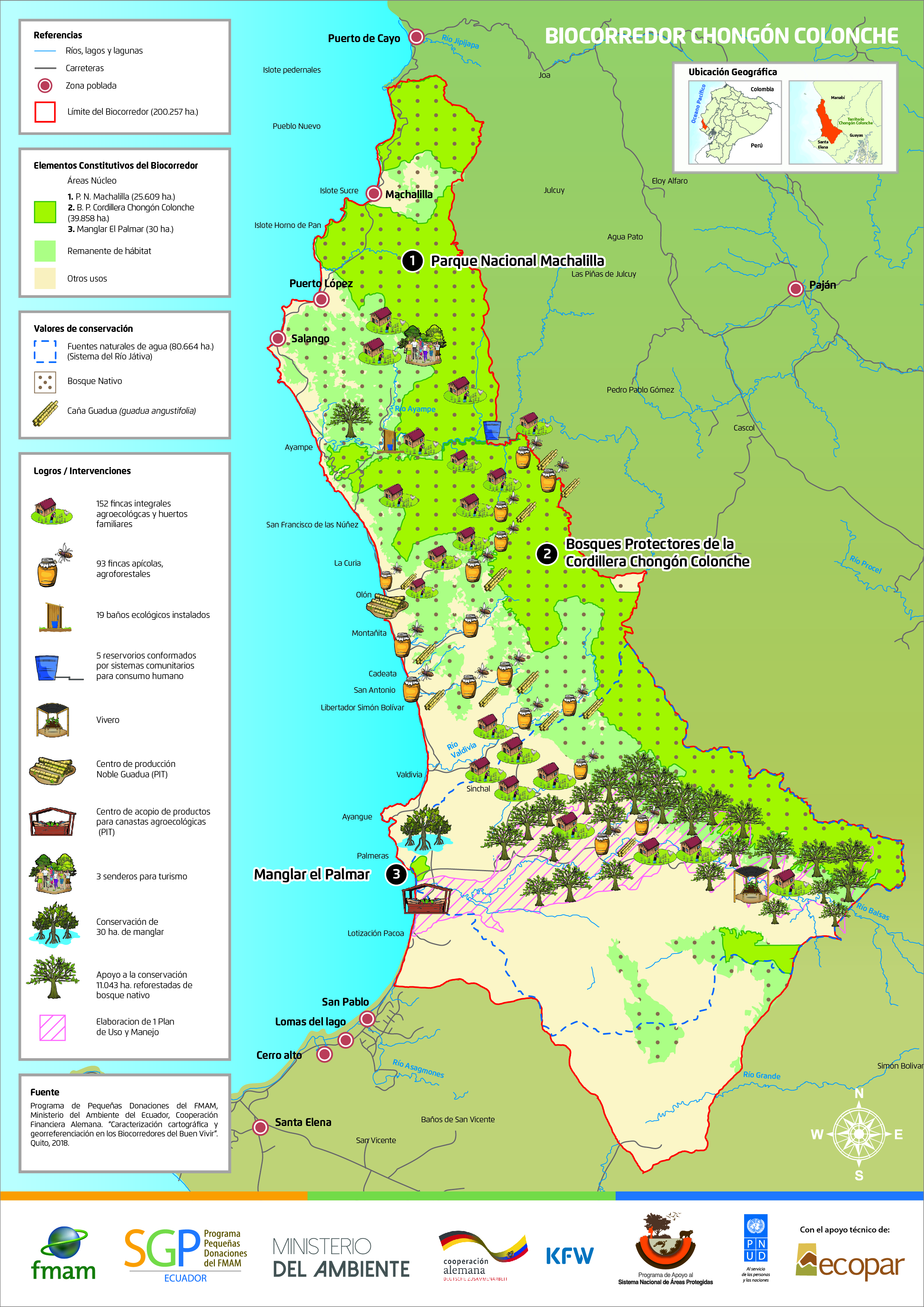 Mapa Biocorredor Chongon Colonche. Detalla los principales logros de la Sexta Fase Opartiva en la construcción y fortalecimiento de los Biocorredores Para El Buen Vivir en un trabajo conjunto con el Programa de Apoyo a las Áreas Protegidas - PASNAP del Ministerio de Ambiente.