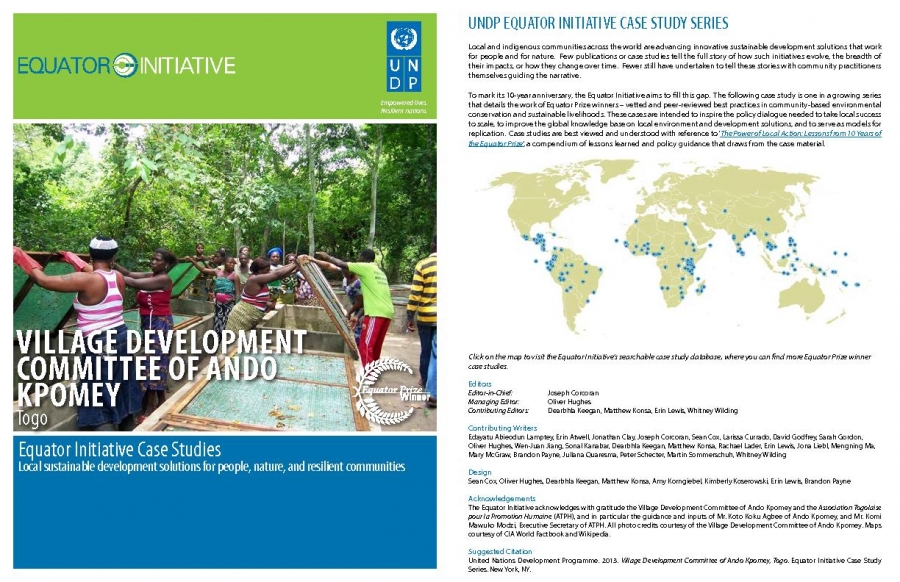 After a devastating bush fire in 1973, the village of Ando Kpomey created a "green belt" buffer around its community that has grown into a 100-hectare forest. A participatory management committee has been established to monitor the forest and its resources and to regulate its use. The community authorizes limited resource extraction to meet livelihood needs and manages revenues generated from the sale of forest-based products. Local women are authorized entry to the community forest to access firewood, significantly reducing the average time needed to forage for cooking fuel. Various crops are grown in the forest, including a range of medicinal plants which have served to meet local healthcare needs.Neighbouring communities have been enlisted to protect the forest, and have benefited from knowledge sharing on natural resource management, participatory planning and forest conservation. The village hosts peer-to-peer learning exchanges to share lessons learned, and has done so with communities and organization across Togo and Burkina Faso.